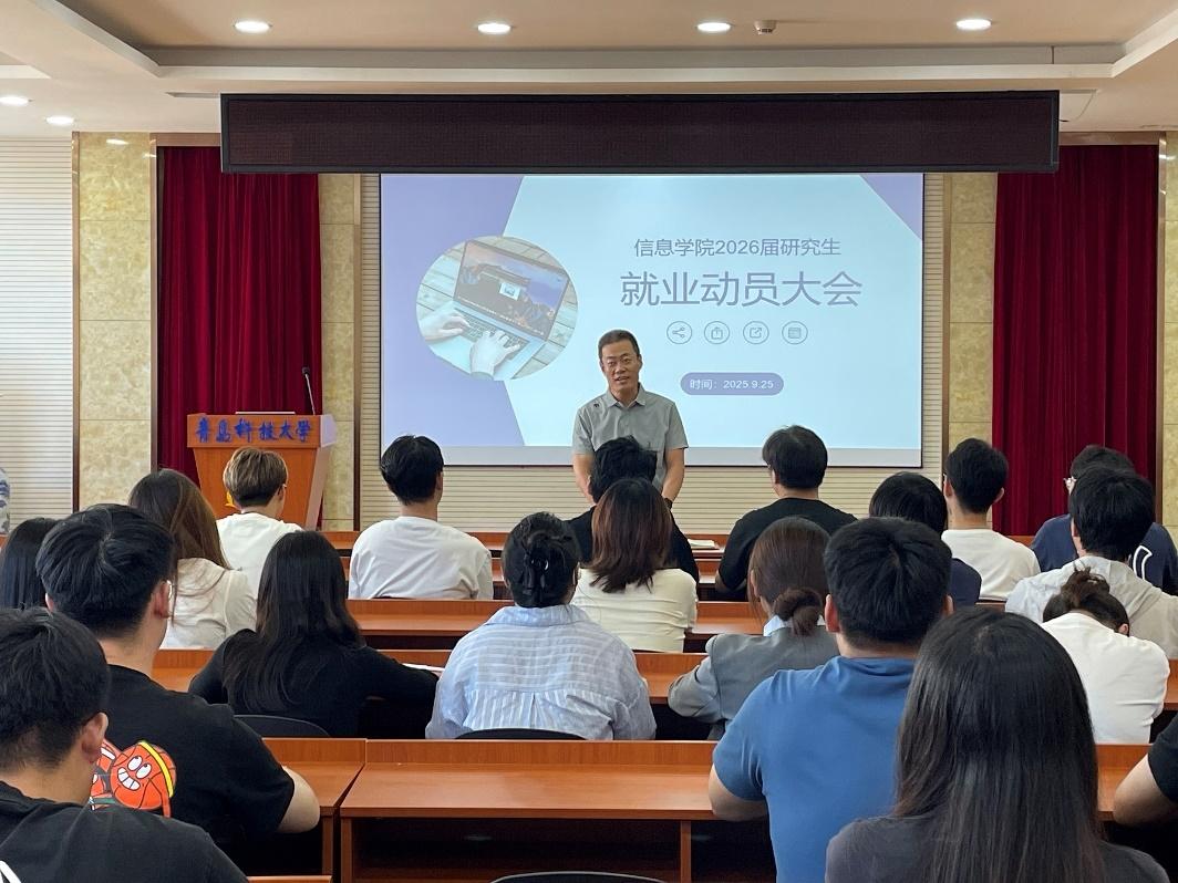 为积极应对当前就业形势,引导毕业生树立正确就业观,助力毕业生明晰职业规划、把握就业先机。信息学院于9月25日下午在402报告厅举行2026届研究生就业动员大会。学院党委副书记兼副院长严增兴作动员讲话,研究生辅导员屈会奇主持会议,学院2023级研究生同学参加。