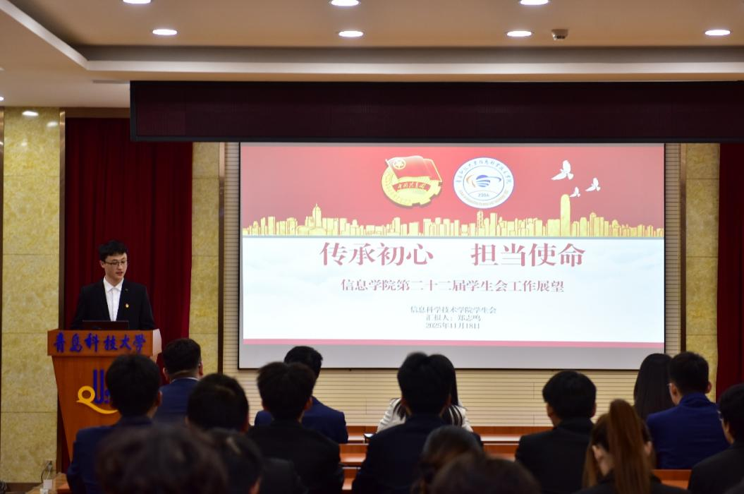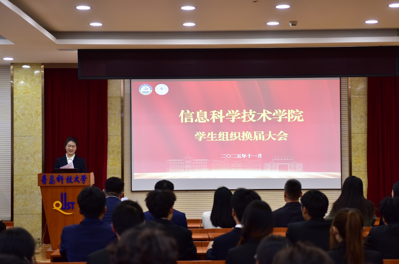 11月18日下午,信息学院于学院楼402会议室召开2025年学生组织换届暨表彰大会。学院党委副书记兼副院长严增兴、团委全体辅导员以及各学生组织骨干代表参加本次大会,宋忆霏担任主持人。